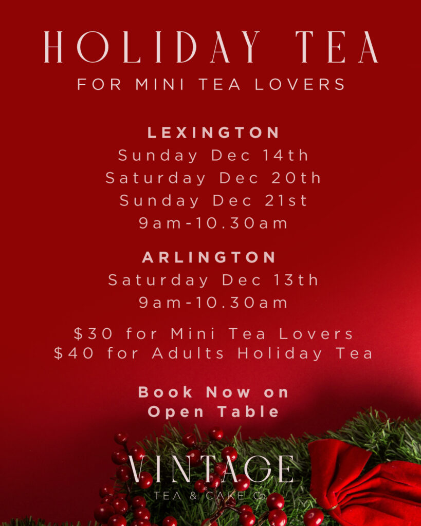 Indulge in Afternoon Tea with a relaxed and delightful twist at The Vintage Tea and Cake Company’s Arlington, Belmont and Lexington Tea Rooms. Sip a flavorful cup of Buckingham Palace Garden Party tea, while enjoying delicious bite size sandwiches, dainty mini pastries and warm traditional scones paired with clotted cream and jam.